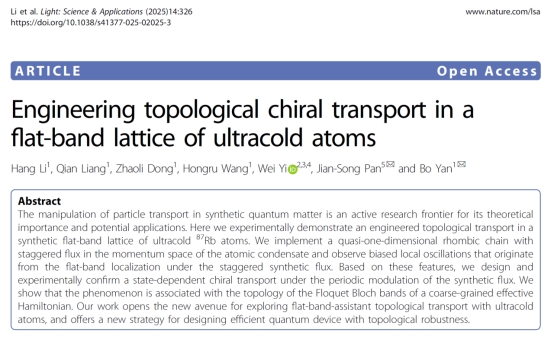 近日,德赢winac米兰潘建松研究员与浙江大学、中国科学技术大学等单位的合作者在Nature出版集团旗下顶级光学期刊《Light: Science & Applications》(中科院一区,近五年影响因子23.1)上发表了题为“Engineering topological chiral transport in a flat-band lattice of ultracold atoms”的研究论文。该研究在超冷原子实验中实现了一种基于平带局域效应的拓扑手性输运机制,为拓扑量子器件的设计提供了新思路。浙江大学李航和梁茜博士为共同第一作者,潘建松研究员与浙江大学颜波教授为共同通讯作者,中国科学技术大学易为教授为重要合作者。