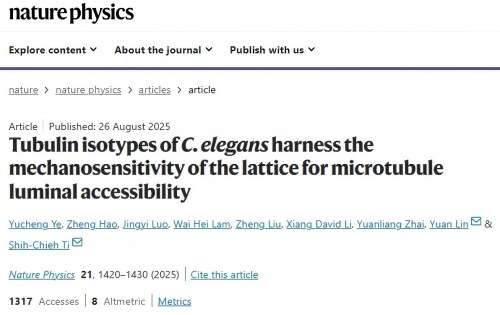 德赢winac米兰始终坚守“为党育人、为国育才”的初心使命,以培养具有深厚科学素养、卓越创新能力和远大理想抱负的一流物理人才为核心,近年来在本科人才培养领域取得了一系列令人瞩目的成就,输送了大批拔尖创新人才。这些毕业生在国内外著名高校和科研机构中持续展现出色的科研能力与发展潜力,受到广泛好评。近日,2018级拔尖班毕业生叶昱成(现香港大学医学院)在细胞生物力学领域取得重要进展研究进展,通过光镊和单分子显微技术,进一步揭示了特定微管蛋白家族赋予微管不同的机械特性和横向相互作用,从而促进了腔内可及性,为腔内蛋白的进入方式提供新机理。相关研究论文以题为《Tubulin isotypes of C. elegans harness the mechanosensitivity of the lattice for microtubule luminal accessibility》于2025年8月26日在线发表于《Nature Physics》杂志,学院2018级拔尖班毕业生、现香港大学博士生叶昱成为论文第一作者。