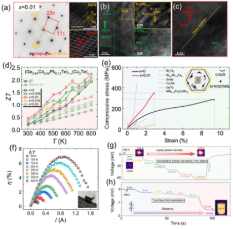 GeTe材料的反掺杂优化策略常导致载流子运输受限,迁移率降低,从而限制热电性能提升。昂然研究员团队通过在GeTe中形成伪立方GeTe、Cu2Te和PbTe的多相共格纳米界面网络,优化了载流子浓度并提高迁移率,实现803 K下峰值zT~2.22,在303–803 K范围内平均zT~1.40的优异表现(如图3所示)。此外,热电器件在激光非辐射能量收集和非接触式热感应中的应用潜力也得以展示。该突破为GeTe基热电器件高效设计提供了新思路,相关工作发表于Advanced Energy Materials。德赢ac米兰官方合作在读博士生朱江龙为论文第一作者,通讯作者为德赢ac米兰官方合作昂然研究员、德赢ac米兰官方合作华西口腔医学院孙强特聘研究员,论文第一单位为德赢ac米兰官方合作原子核科学技术研究所。