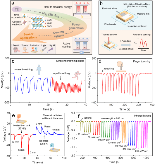 传统的固态Mg3(Sb, Bi)2热电研究主要聚焦于提升热电性能及发电制冷效率,较少涉及其他潜在应用领域,限制了热电材料的发展。昂然研究员团队通过间隙Co掺杂显著提高该材料的热电性能,成功实现483 K下27.3 μW cm−1K−2的功率因子,并展现400 MPa的抗压强度及25%的应变能力。团队还创新制备了固态热电传感器,展示了在呼吸监测、手指触摸、热辐射、红外激光照射及液体接触等多场景中的卓越性能(如图4所示)。该研究为医疗、电子设备、核技术等领域开辟了新空间,相关工作发表于Cell Press期刊Device。德赢ac米兰官方合作在读博士生田邦州为论文第一作者,通讯作者为德赢ac米兰官方合作昂然研究员、孙强特聘研究员,论文第一单位为德赢ac米兰官方合作原子核科学技术研究所。
